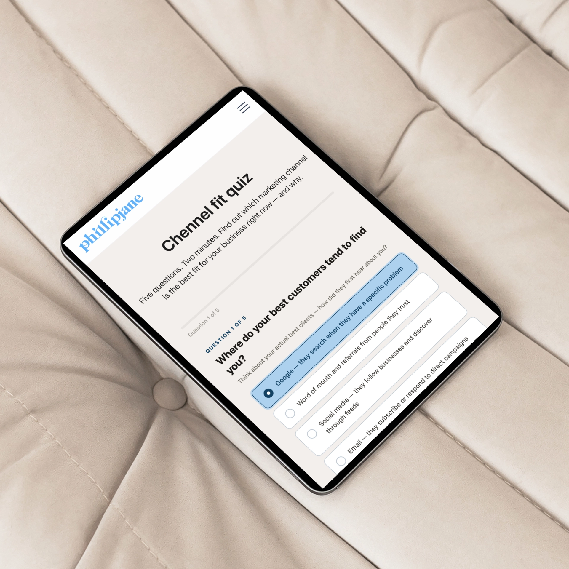 The Channel Fit Quiz is part of our Academy known as the Groundwork Series. If you would like to join the series sign-up for free here: phillipjane.com.au/academy/marketing-strategy