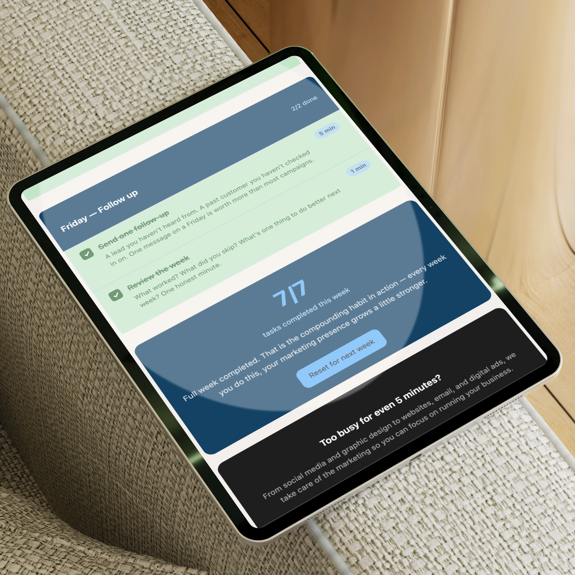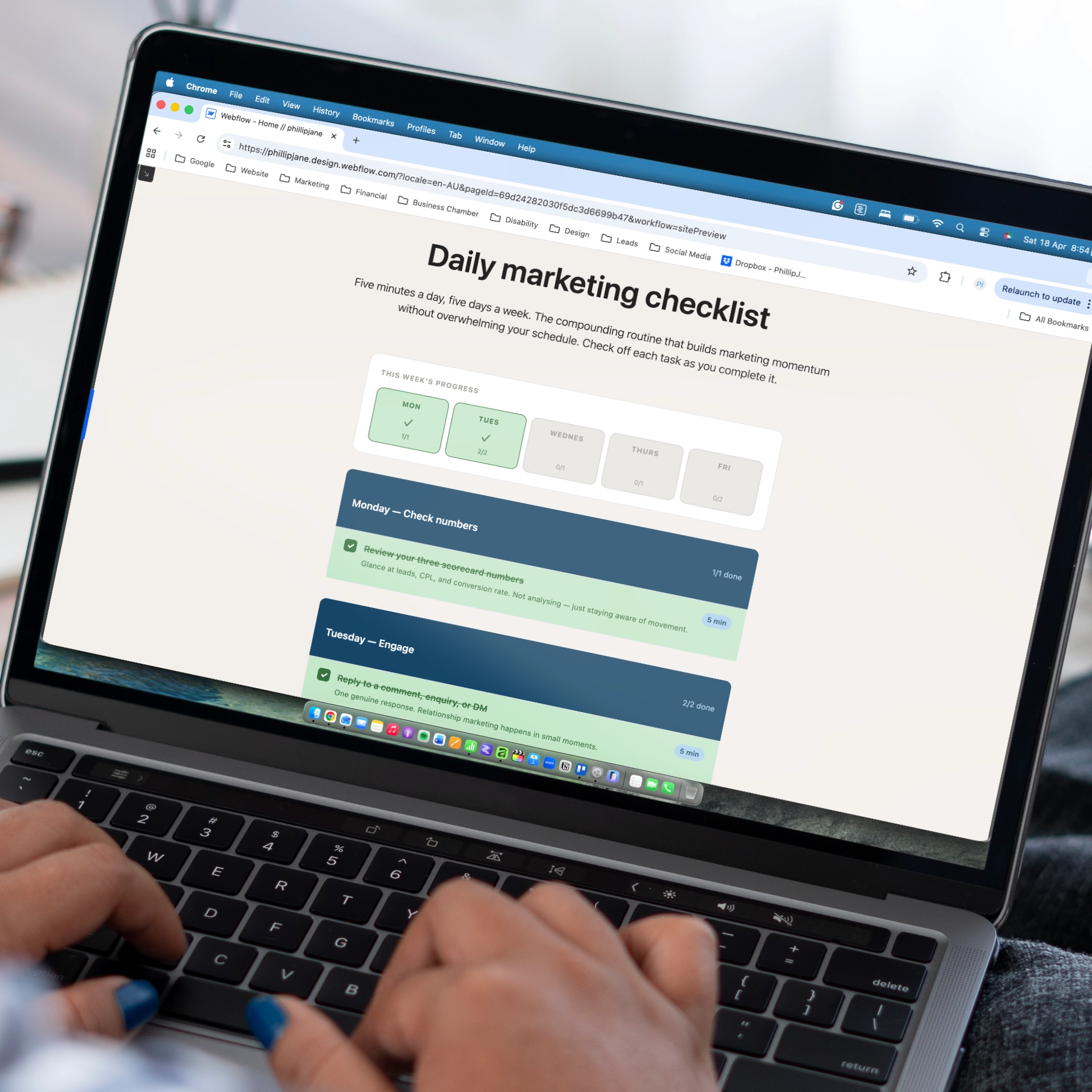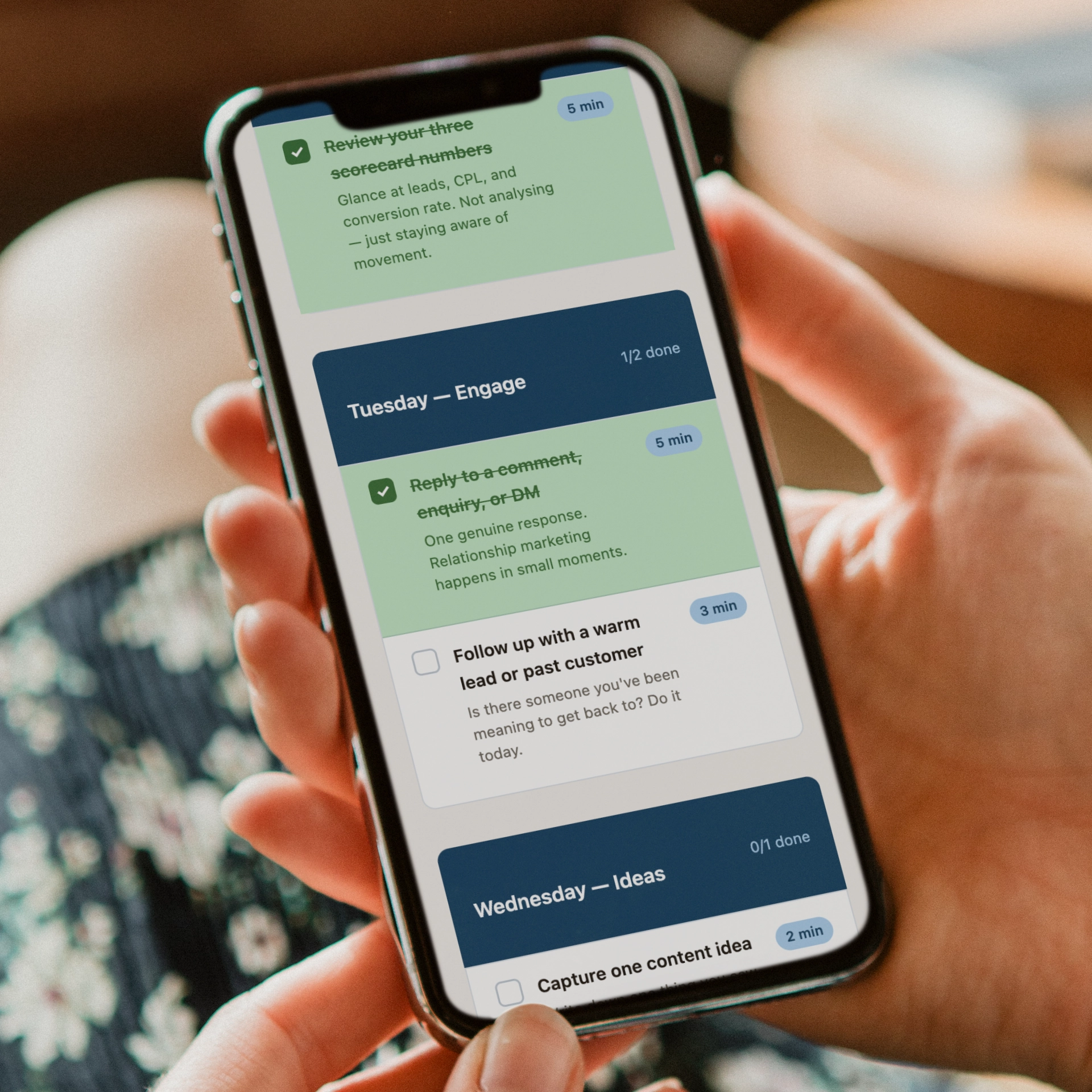The Daily Marketing Checklist turns everything you've learned in our Groundwork Series into a five-minute-a-day routine. Monday to Friday, five simple actions that keep your marketing moving without adding to your mental load. Engage, capture, share, follow up, review. It's deliberately unglamorous — because the businesses that win at marketing aren't doing anything extraordinary. They're just showing up every day in a way most others don't.