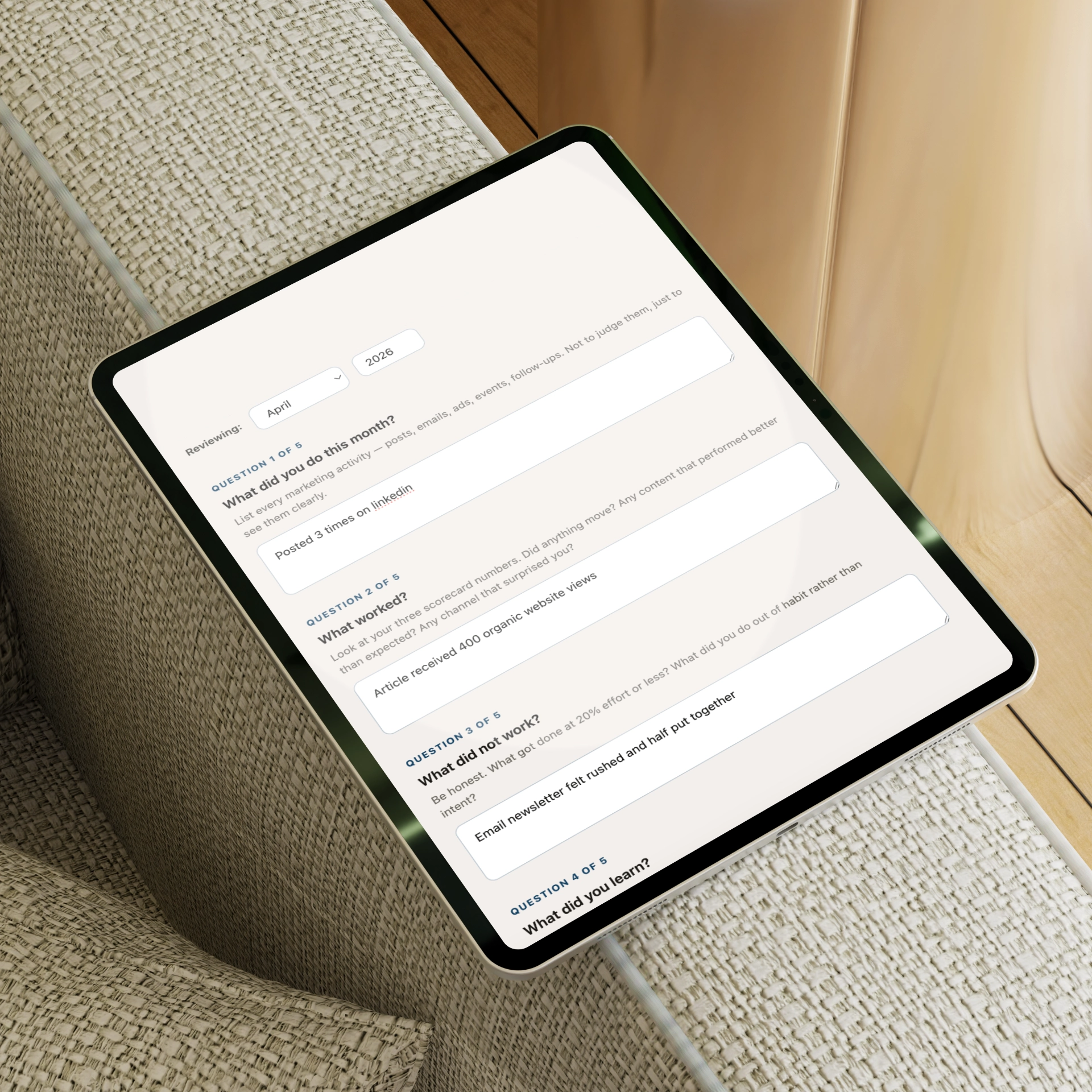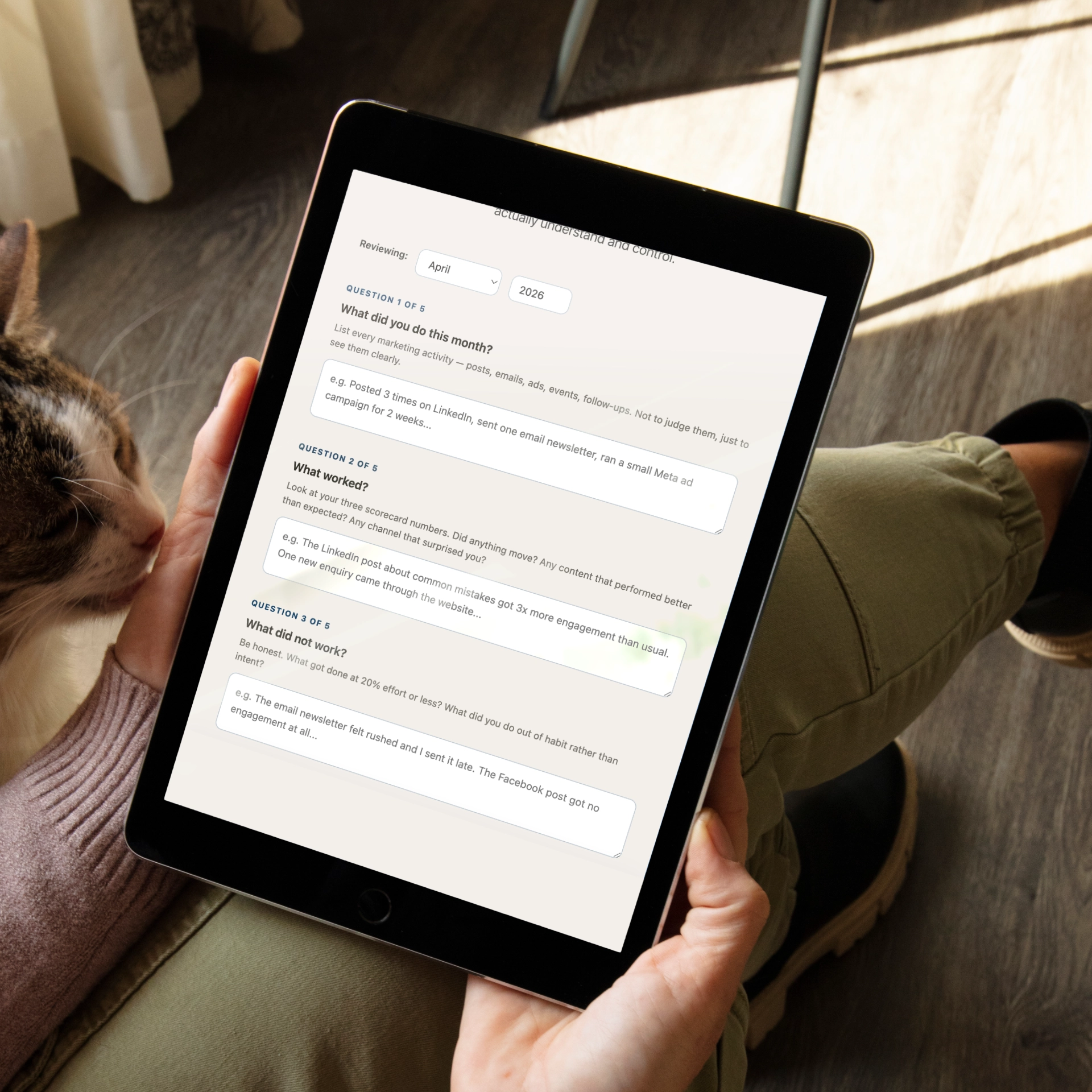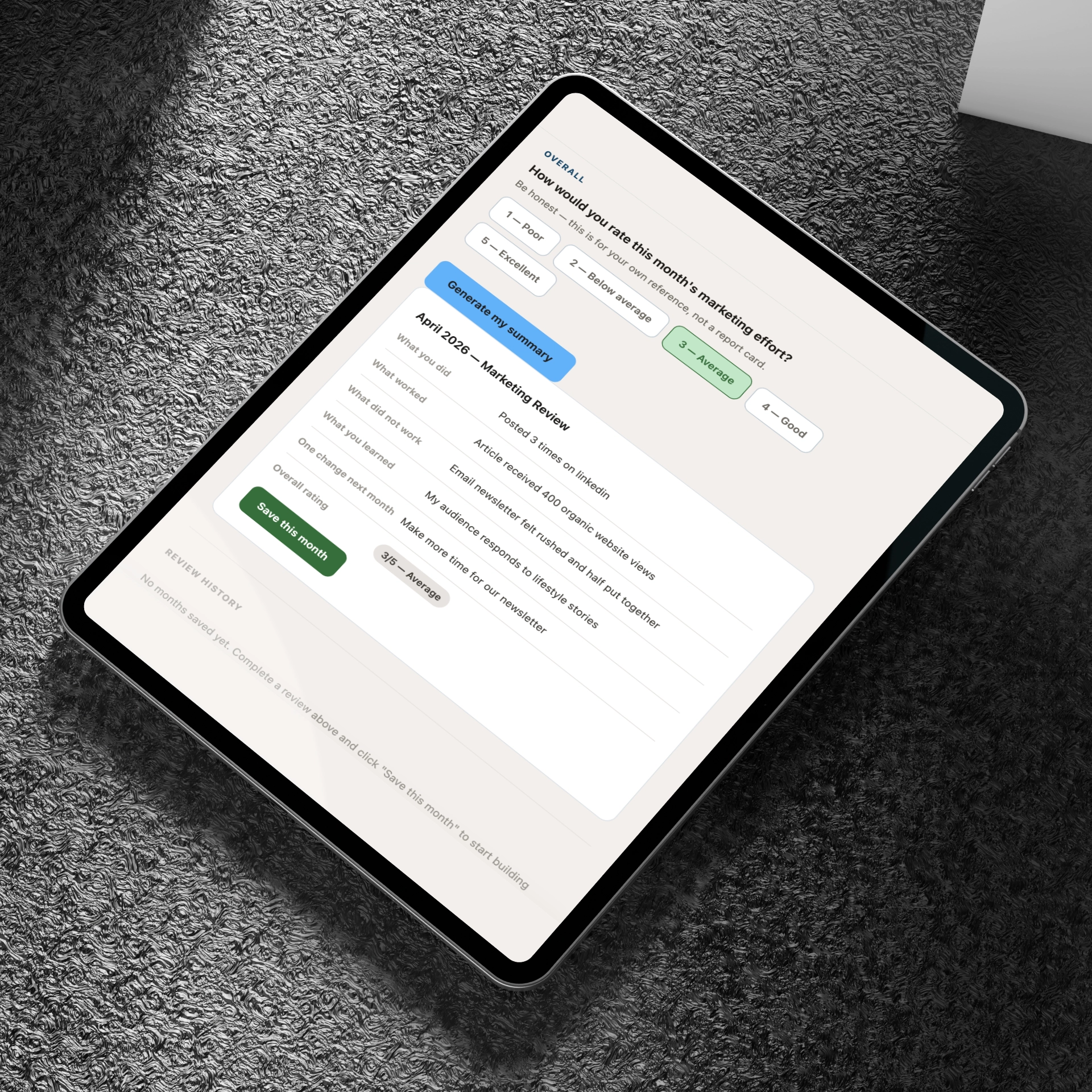 The Monthly Marketing Review is a structured 15-minute session you run at the end of each month to assess what worked, what didn't, and what to adjust. Five questions, honest answers, one change to make next month. Marketing without review is just repetition. This is what separates businesses that iterate and improve from those that keep doing the same things and wondering why the results don't change.
