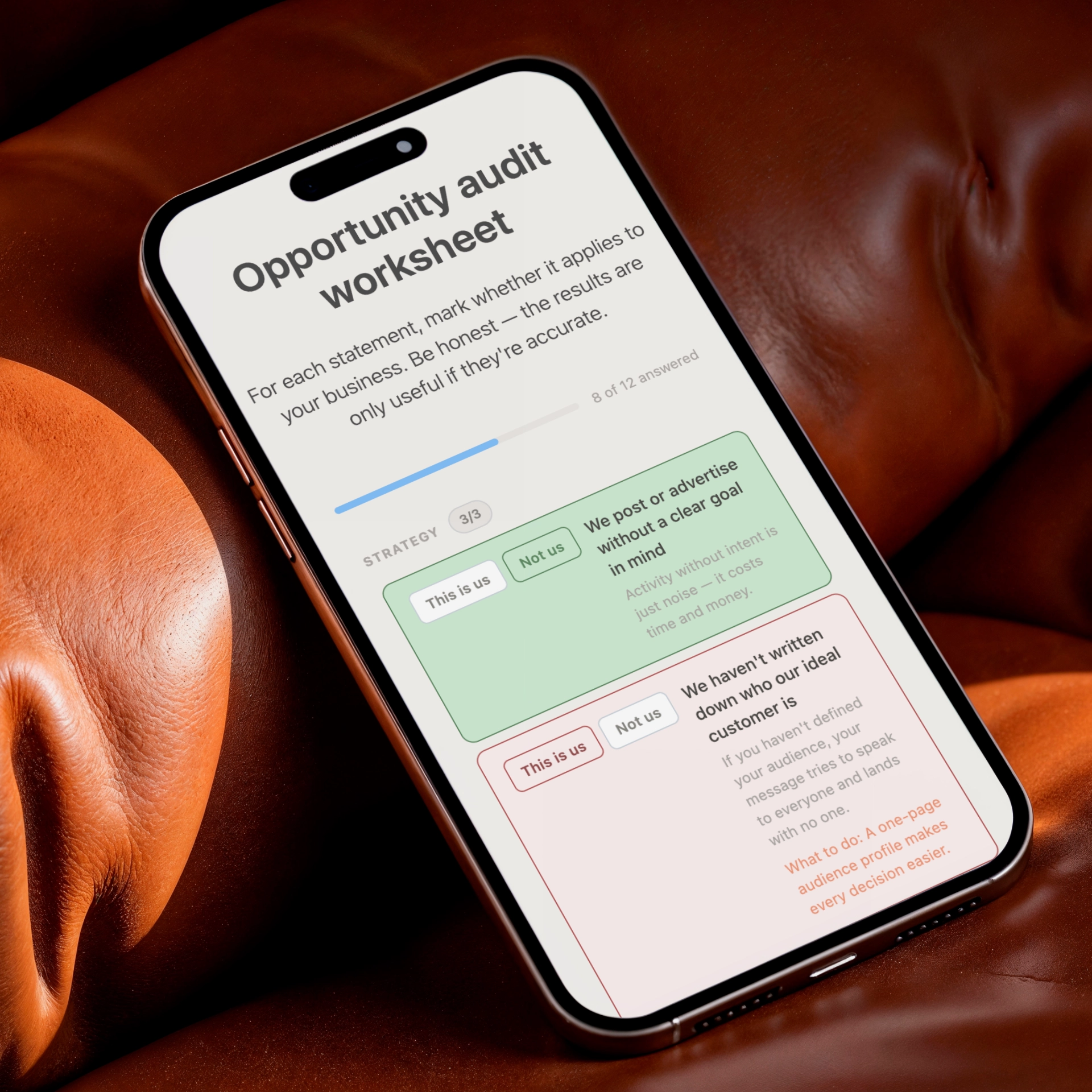 The Opportunity Audit Worksheet is a self-diagnostic built around the most common strategic mistakes small businesses make. For each one, you mark whether it applies to your business — and if it does, you get an immediate action to fix it. It's one of those tools that's uncomfortable in the best possible way. The businesses that grow are the ones willing to look honestly at what isn't working. This gives you the framework to do that.