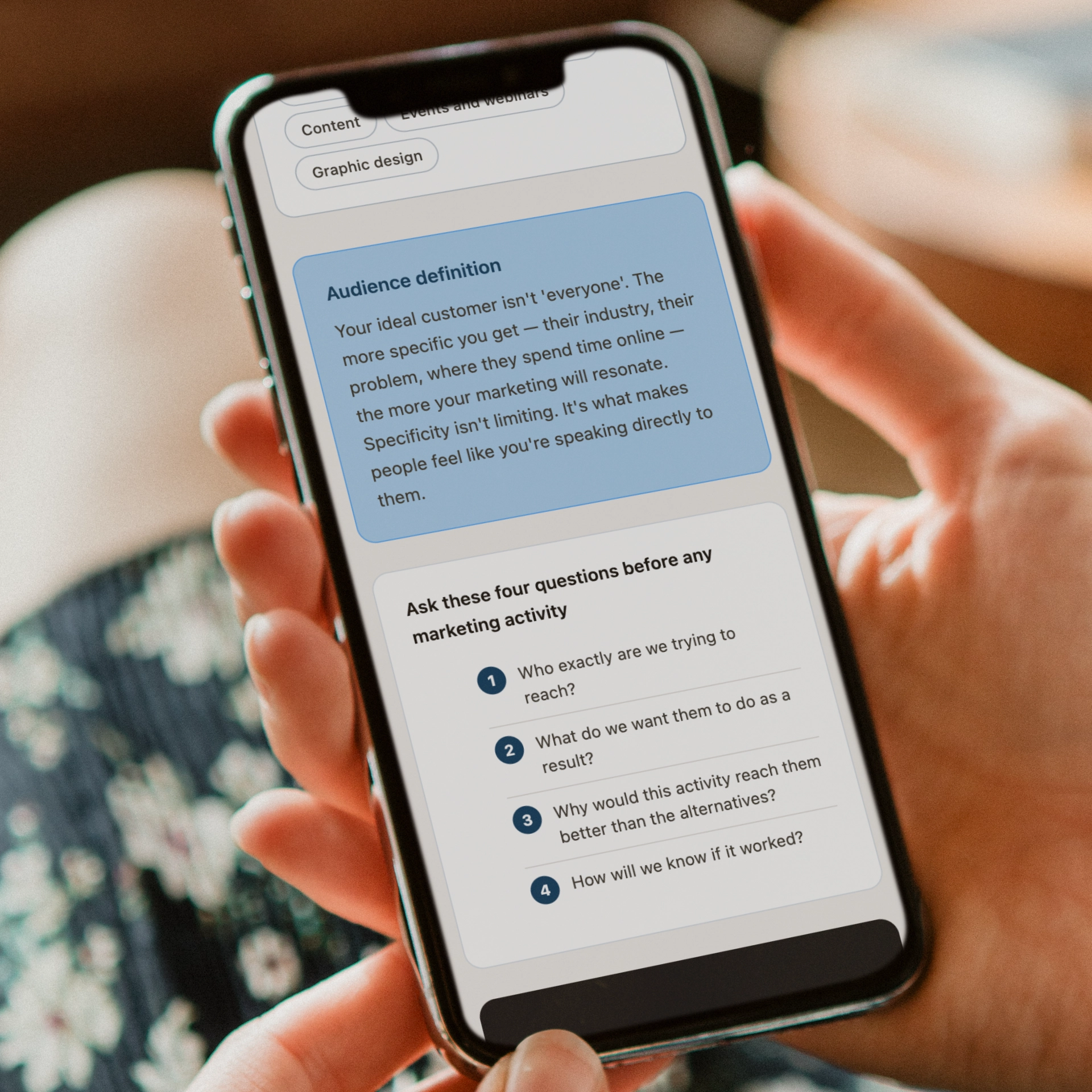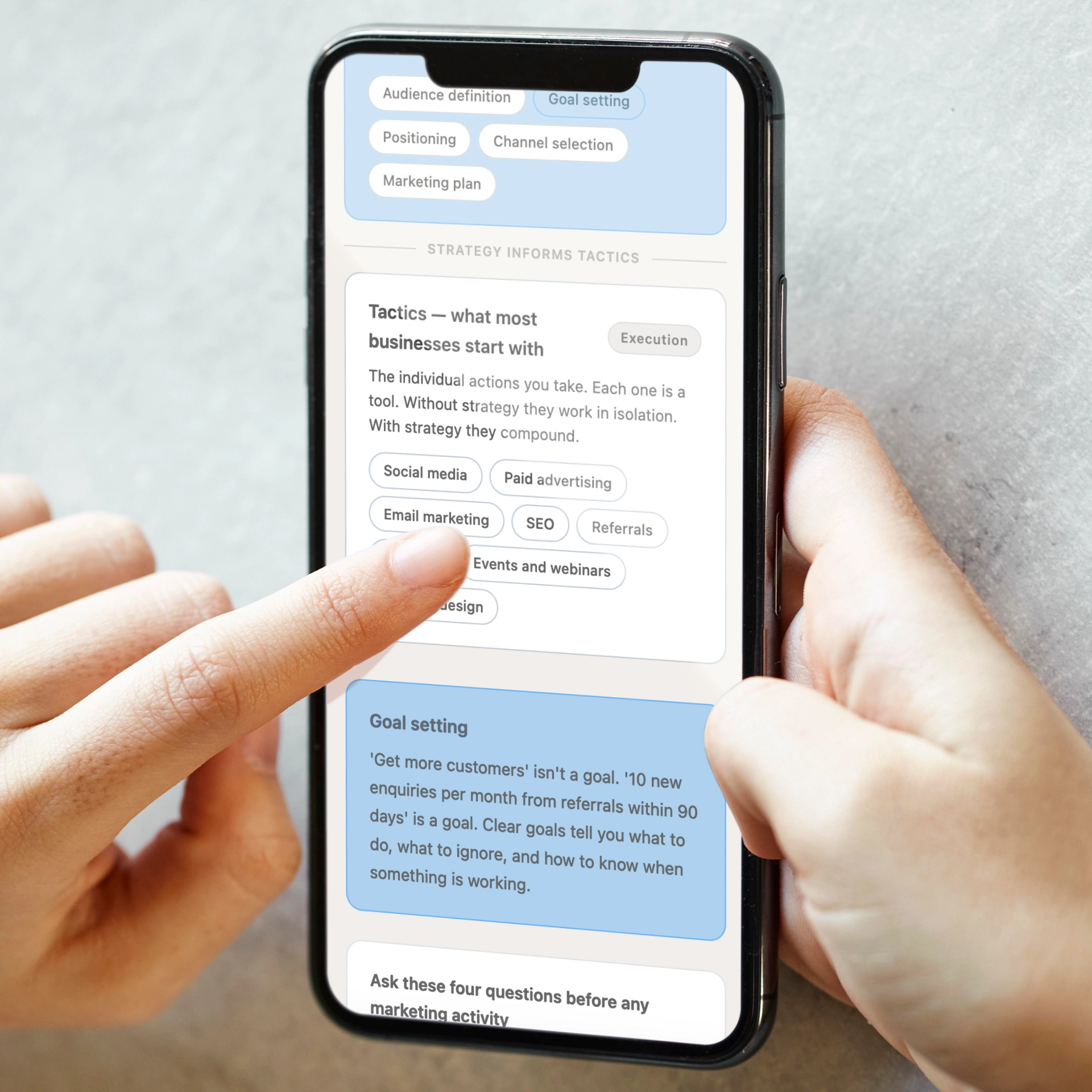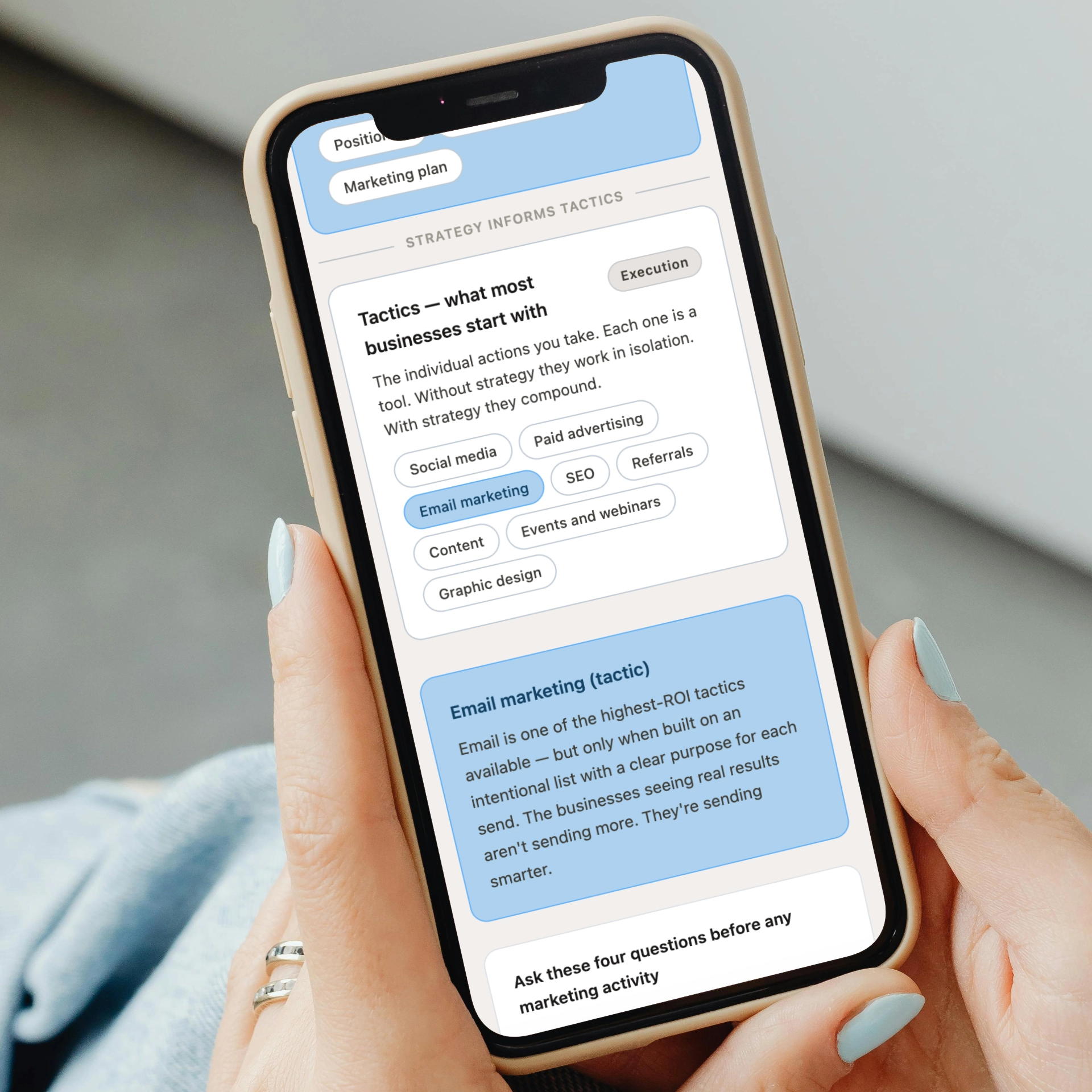 The Strategy vs Tactics Matrix is an interactive map of how every common marketing activity connects back to strategy. Click any tactic — social media, paid ads, email, SEO — and you'll see exactly where it sits, what role it plays, and what to think about before you invest time or money into it. It's the kind of clarity most business owners say they wish they'd had from day one.
